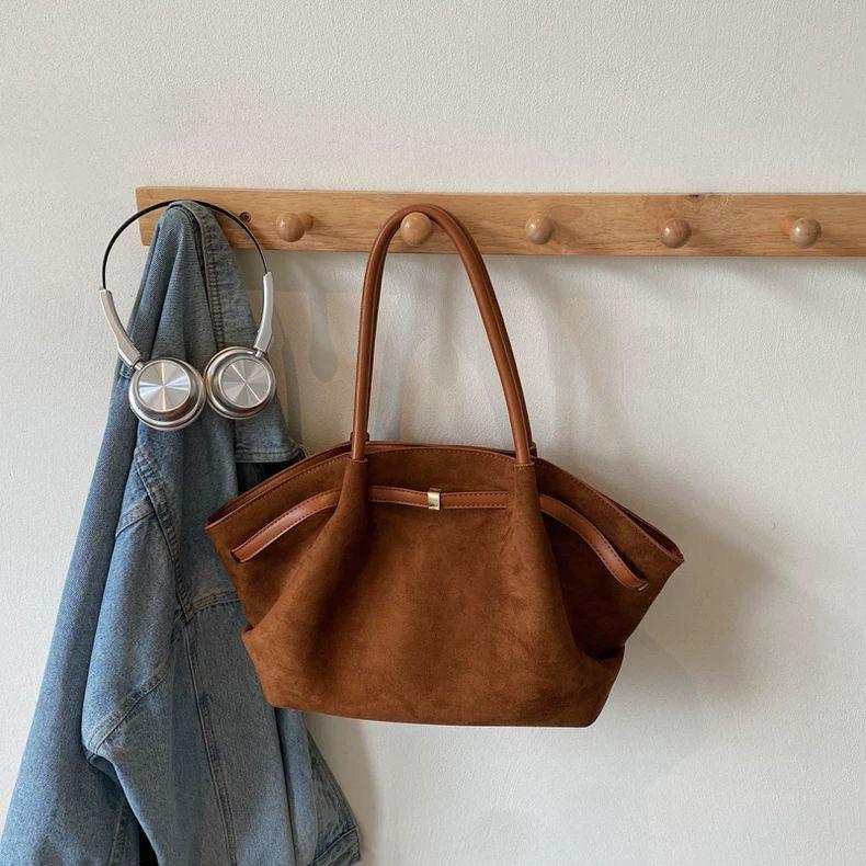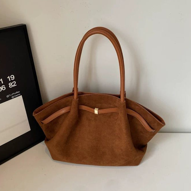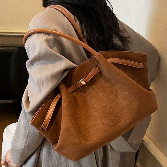 The brown suede adds depth and character, making this tote a versatile companion for both casual and formal outfits.