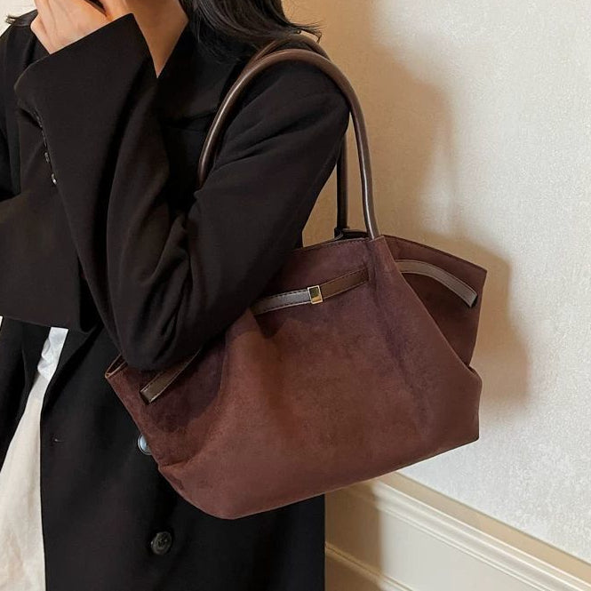 The Ivera Coffee Brown Suede Tote Bag is defined by its deep, refined tone and structured form. Crafted from original suede with leather straps, it offers a sophisticated alternative to classic neutrals.